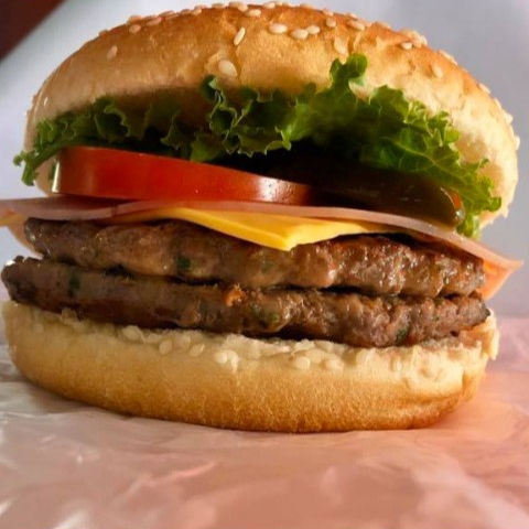 Doble torta de carne de res casera, doble queso cheddar, rebanada de tomate, cebolla, lechuga, salsa de tomate y mayonesa.