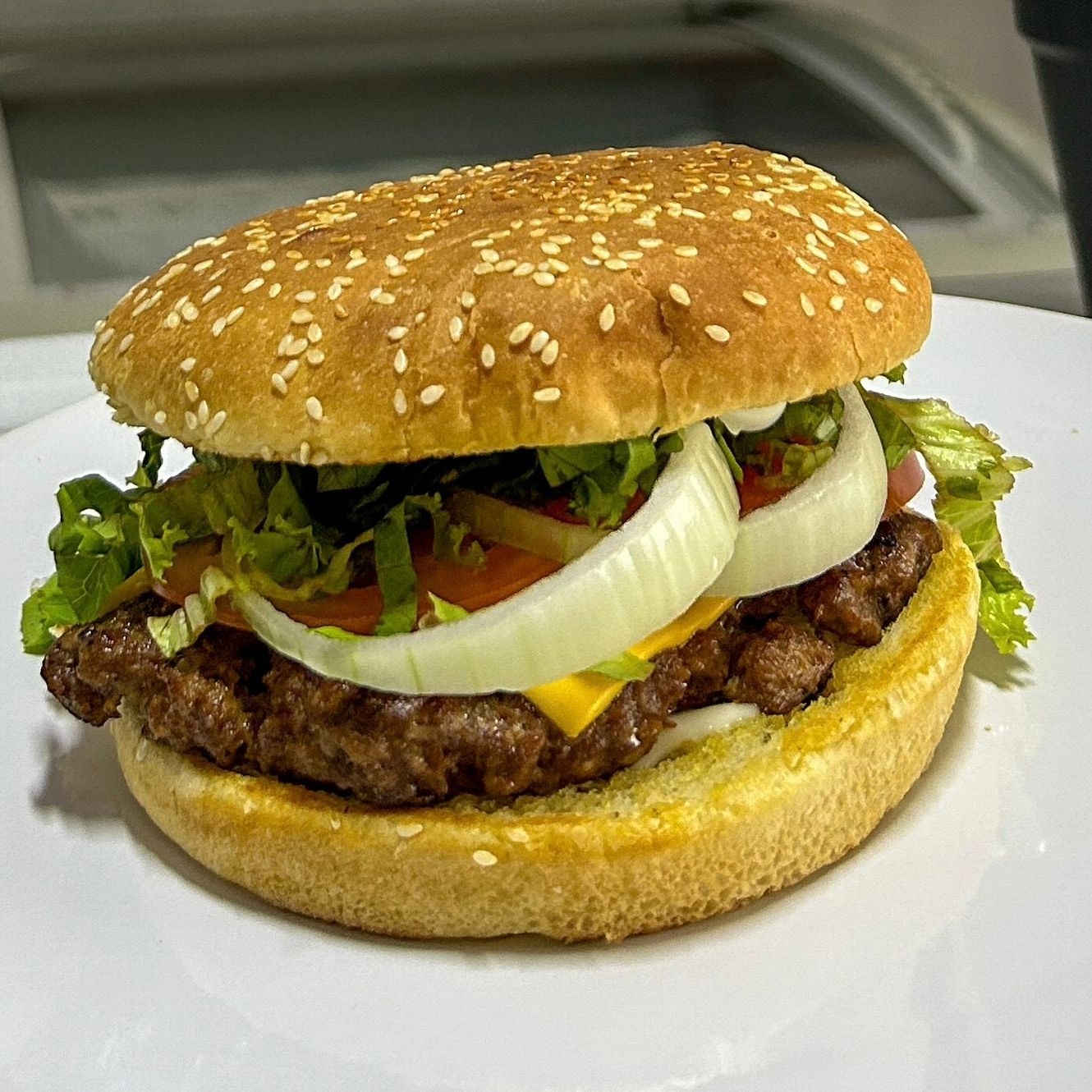 Torta de carne de res casera, queso cheddar, rebanada de tomate, cebolla, lechuga, salsa de tomate y mayonesa.