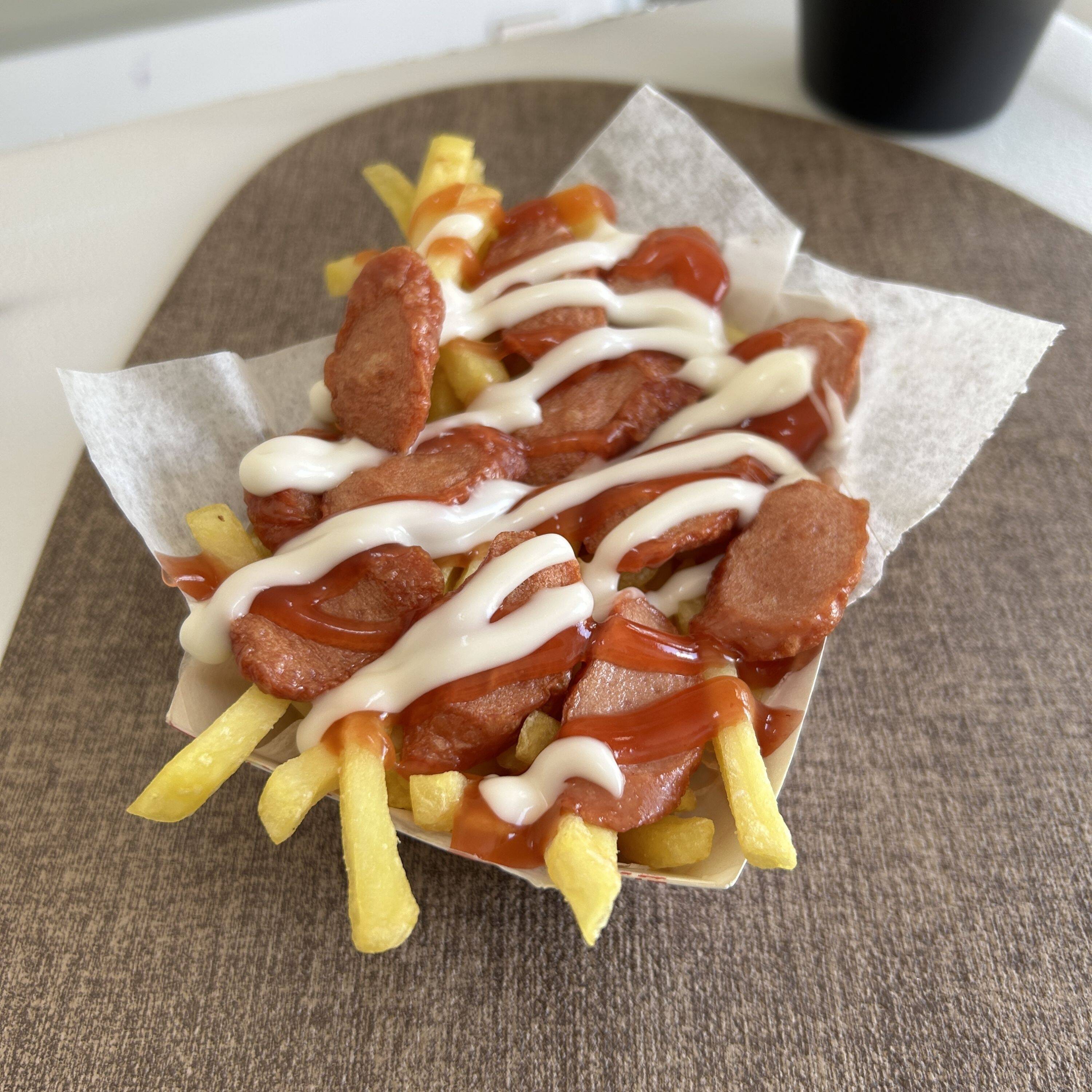 Orden de papas fritas con salchichas en trozos, salsa de tomate y mayonesa.
