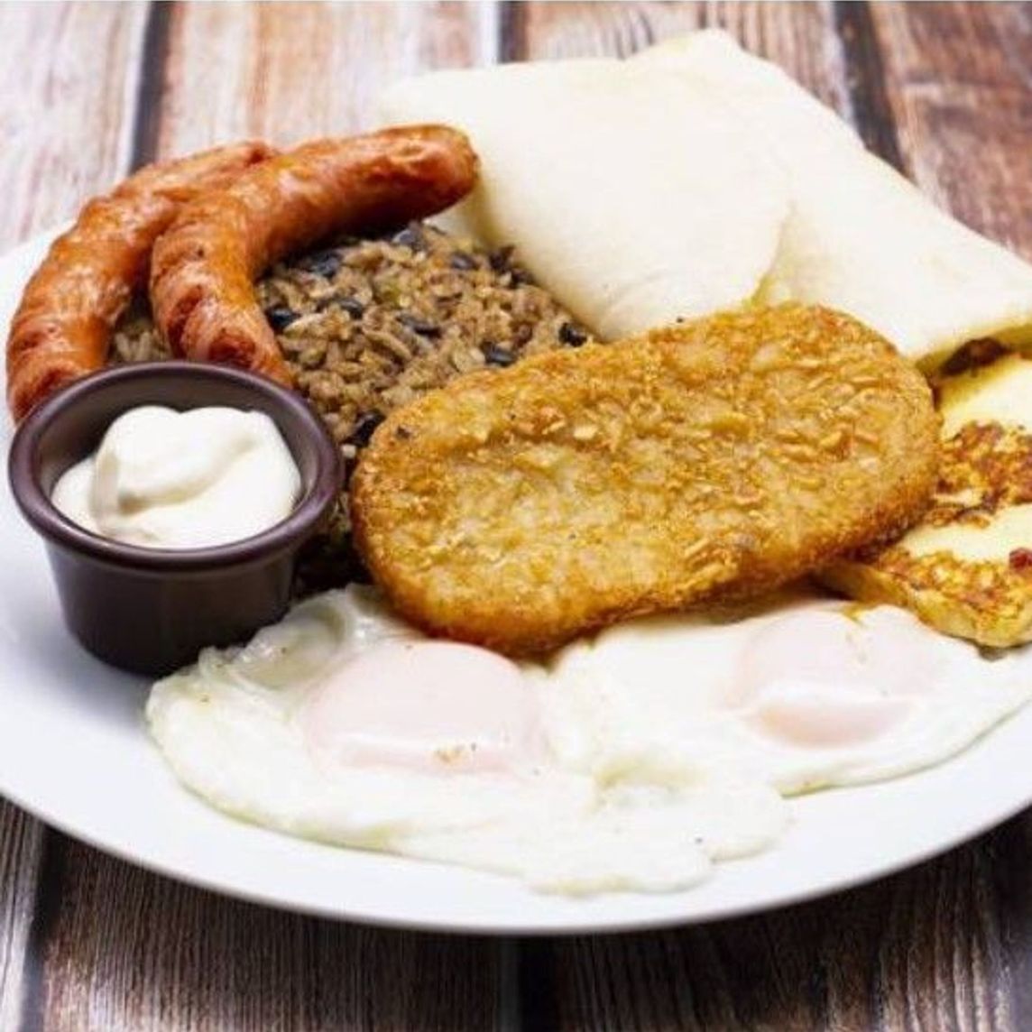 Delicioso gallo pinto, acompañado de huevos al gusto, queso al gusto, un hash brown, dos salchichas de desayuno y una tortilla casera