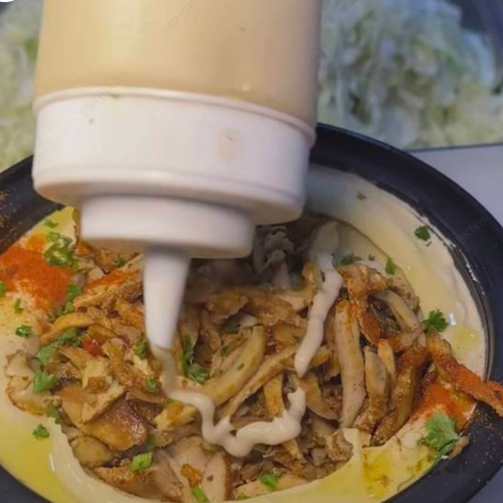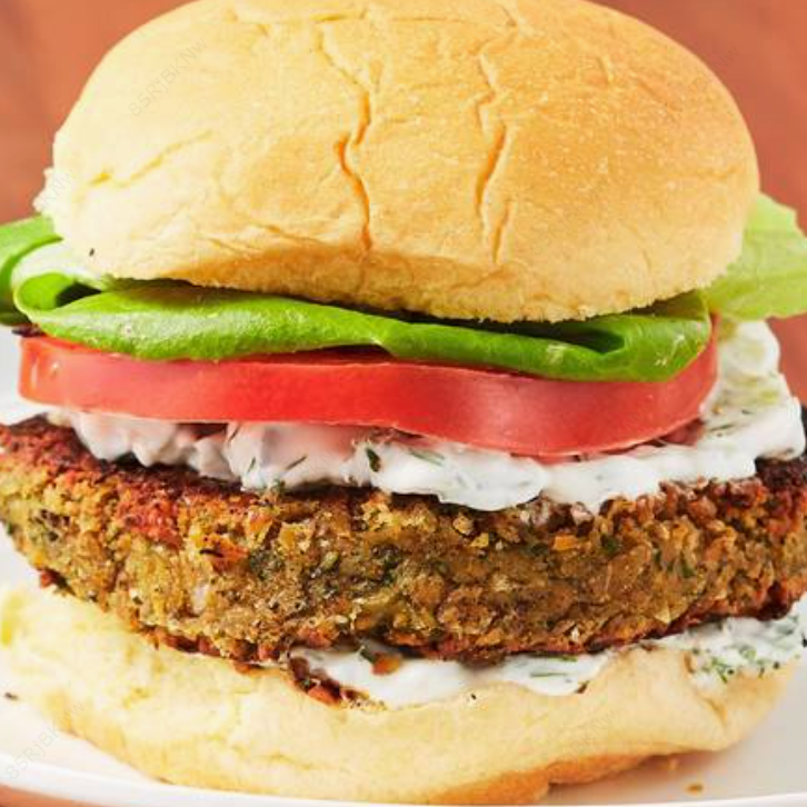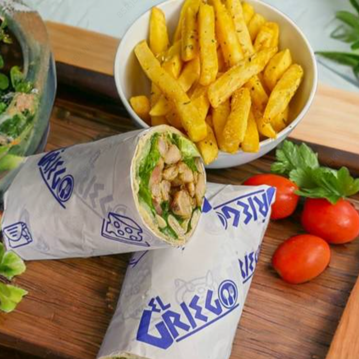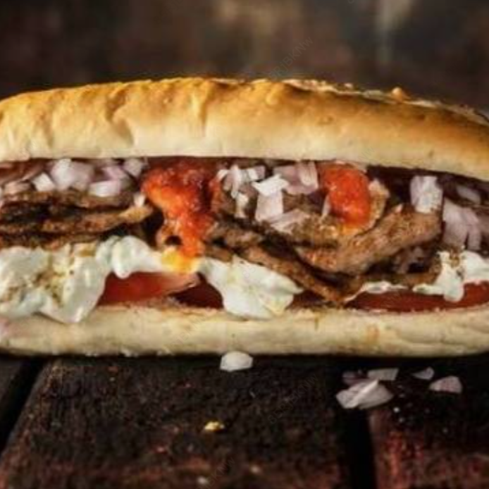 Pan libanes con tortas de carne de cordero a la parrilla, hummus, tomate, cebolla, lechuga, pepino. Y nuestra salsa blanca. Acompañado de papas fritas.
