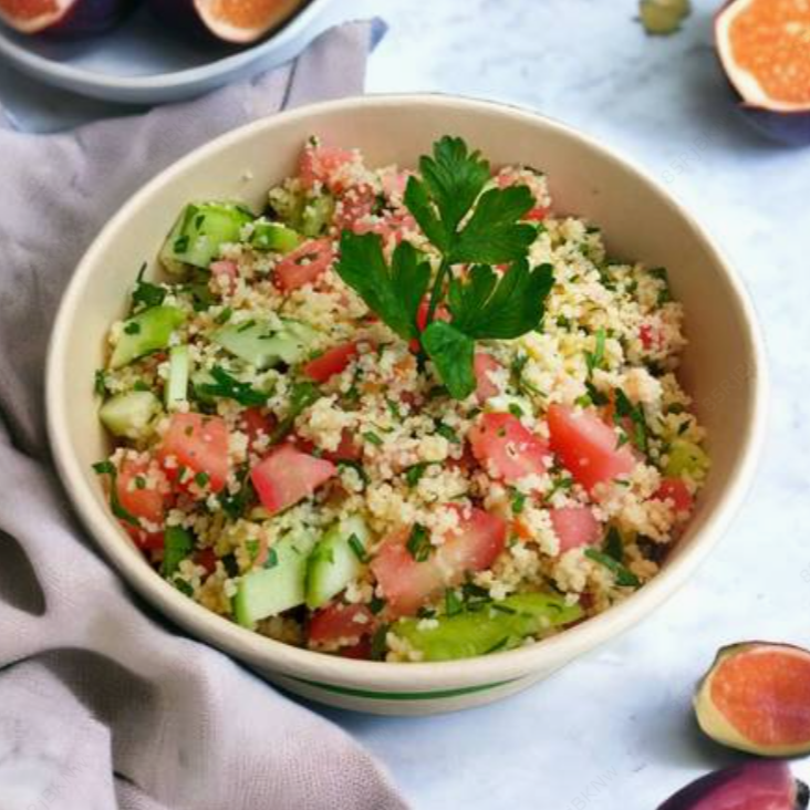 Ensalada de couscous tabulé estilo griego, exótico y delicioso couscous, con tomate, pepino y hierbas aromáticas, aderezado con aceite de oliva virgen y limón.