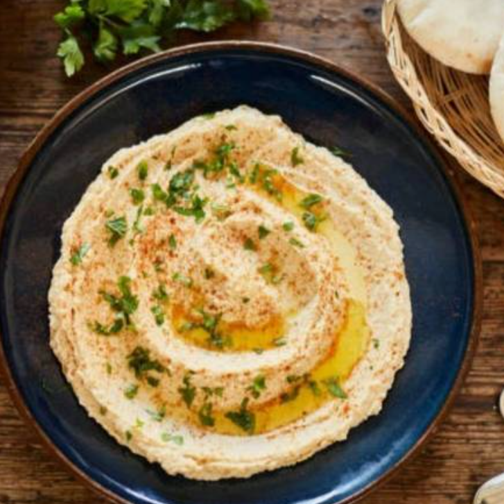 Crema de garbanzos con tahini y aceite de oliva extra virgen. Acompañado con un pan pita.