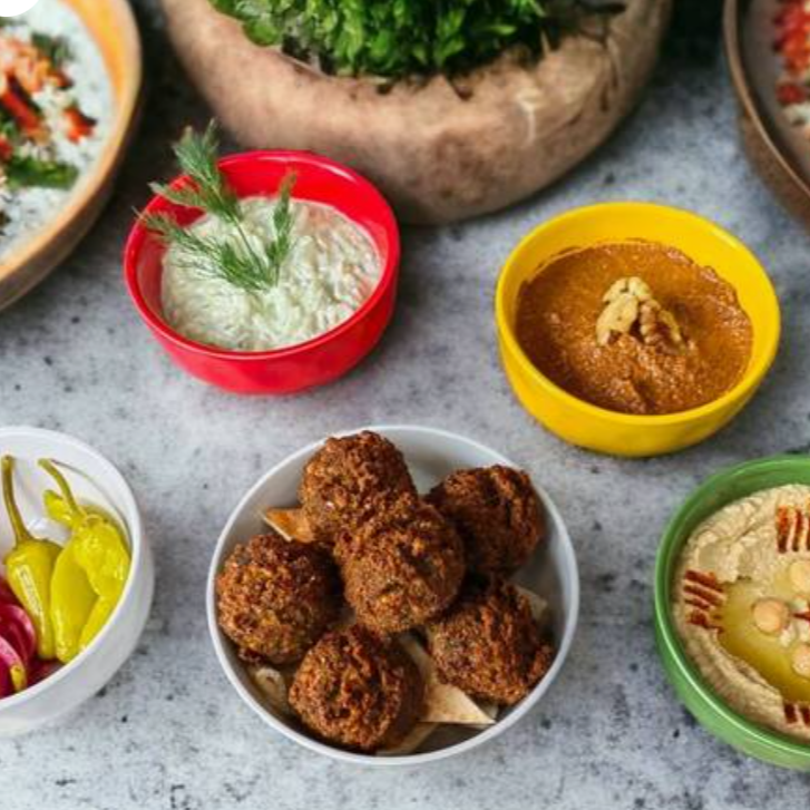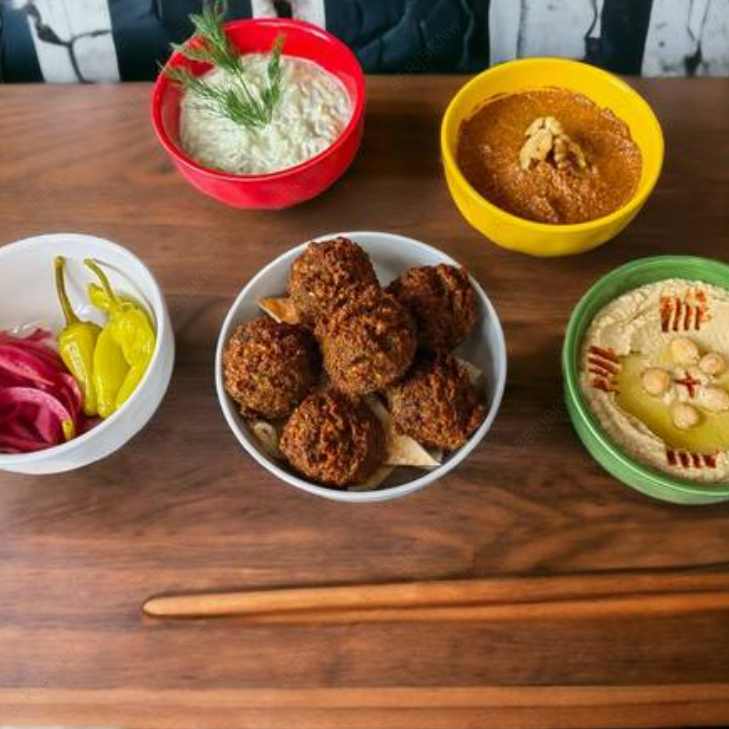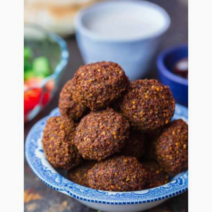 Bolitas (6) hechas con nuestro delicioso falafel, acompañadas con ensalada verde uno de nuestros dips de 150 g para elegir y un pan pita.
