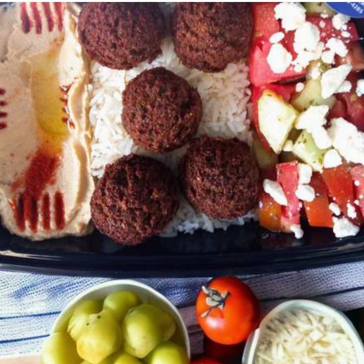 Bowl de Falafel: arroz tipo basmati con 5 bolitas de falafel, hummus con aceite de oliva y páprika ahumada y ensalada griega.