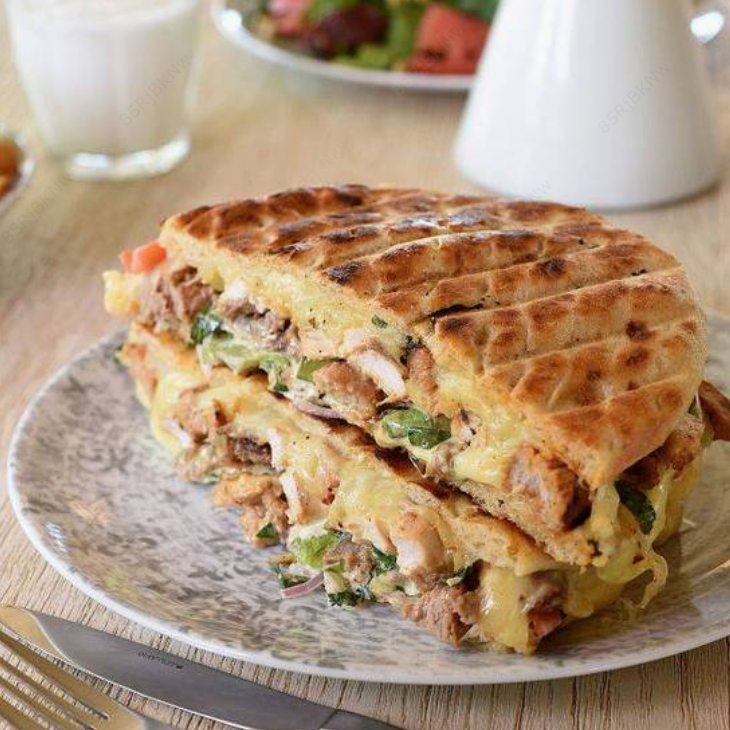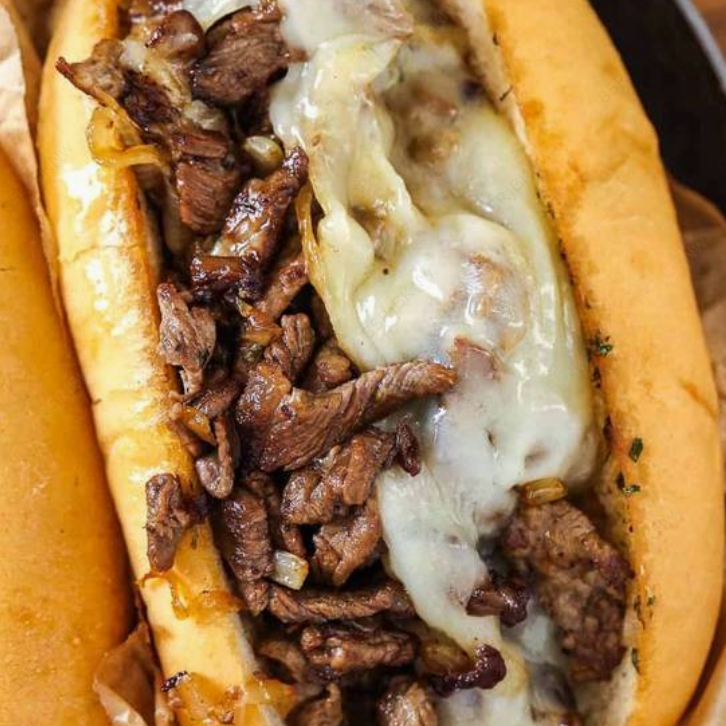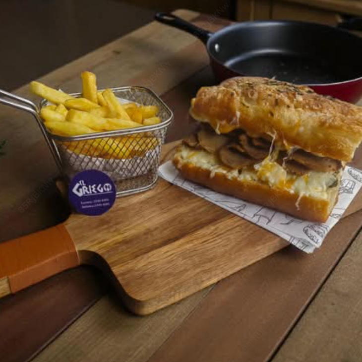 Focaccia hecha por nosotros; rellena con el gyro de su elección, salsa El Griego, tomate y una mezcla de quesos derretidos. Acompañada de papas fritas.