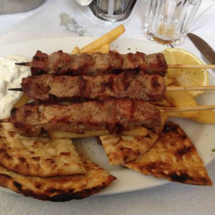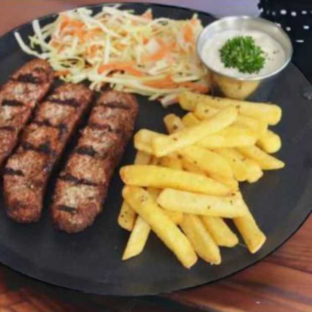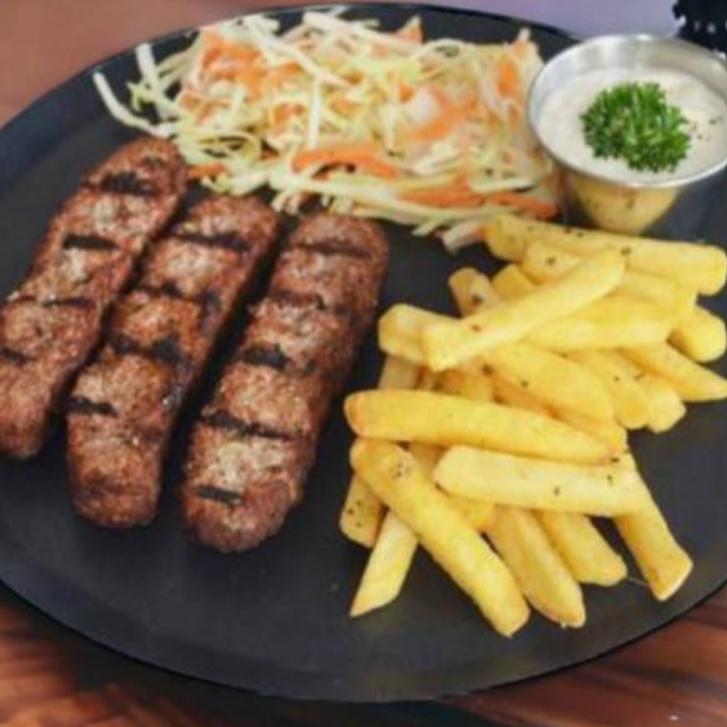 Kebabs 4 pzs de carne molida de cordero a la parrilla. Acompañados, de papas fritas, pan pita, tzatziki y ensalada.