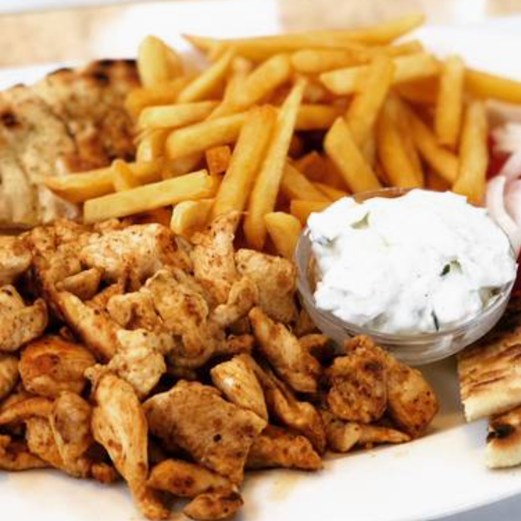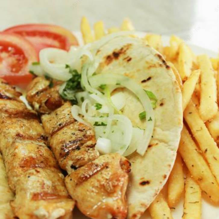 Brochetas de pollo a la parrilla, marinadas. Acompañadas de papas fritas, pan pita, tzatziki y ensalada.