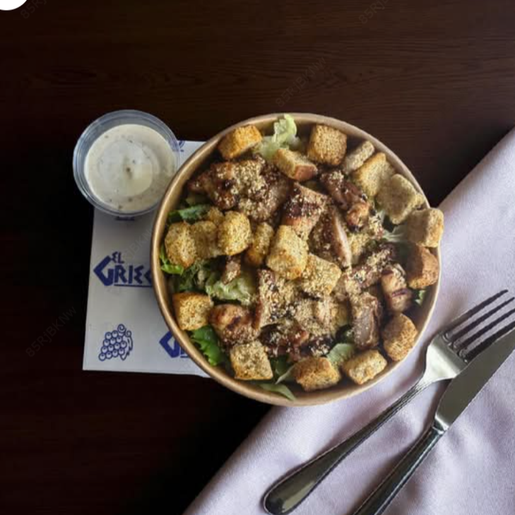 Ensalada césar: Lechuga fresca, pollo asado a la parrilla, crutones tostados con aceite de oliva y ajo, queso parmesano y aderezo cremoso césar.