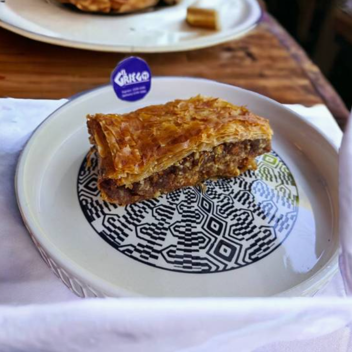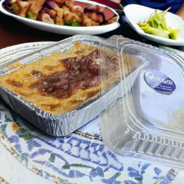 Uno de los más típicos platós griegos. Delicioso pastel hecho por capas con papas, berenjena, carne molida, especies y salsa blanca al horno. Acompañado con ensalada verde.