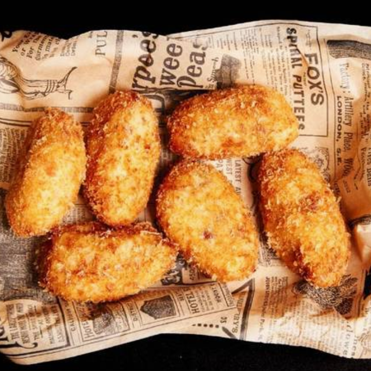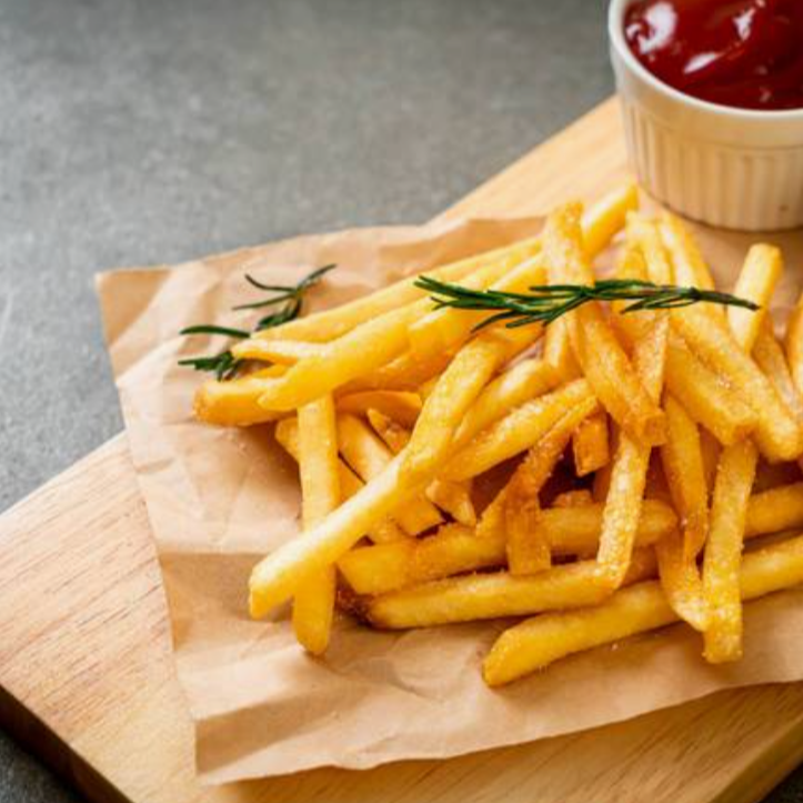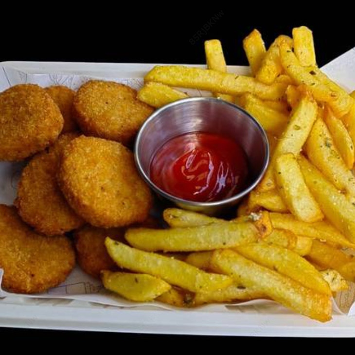 Chicken nuggets (160g / 8 pzs)con papas acompañados con ketchup.