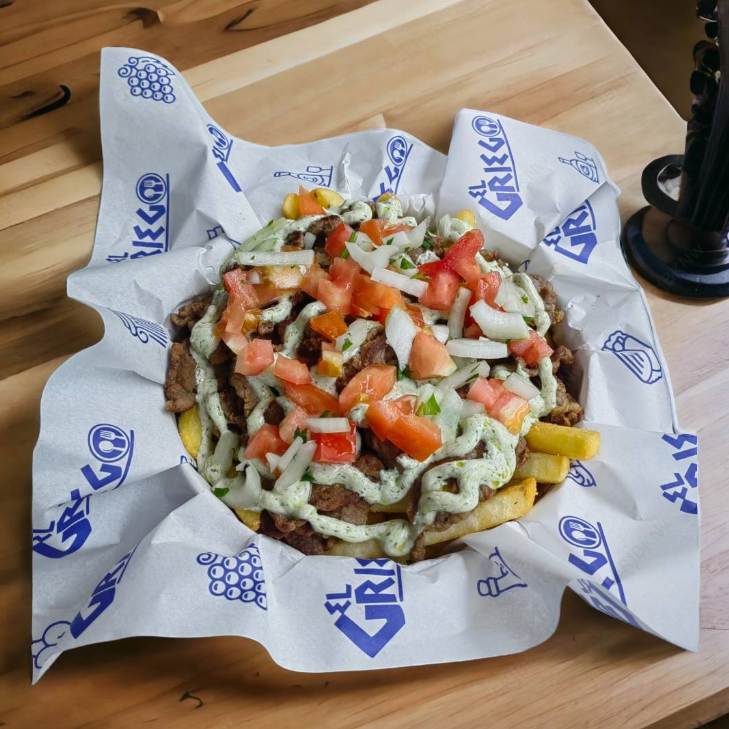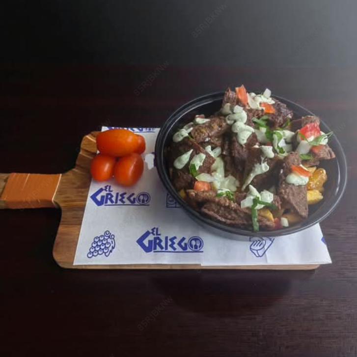 Su carne preferida sobre nuestras originales papas fritas, sazonadas con nuestro toque especial, salsa de hierbas frescas y ajo, trocitos de tomate, cebolla y queso feta.