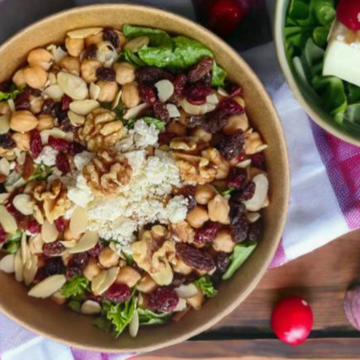 Base de ensalada verde, con garbanzos cocidos por nosotros, almendras, pasas , arándanos, nueces y queso Feta. Con 2 opciones de aderezos a escoger.