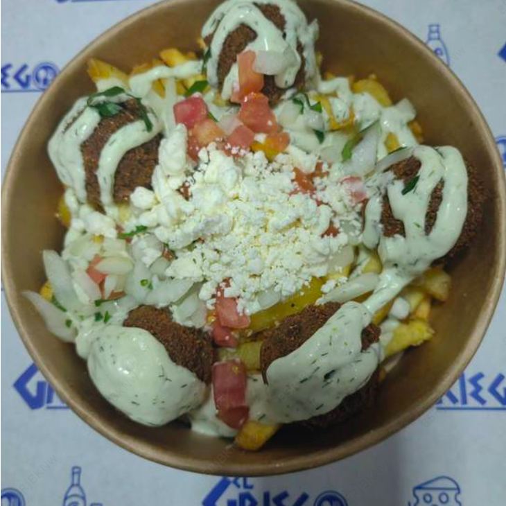 Falafel sobre nuestras originales papas fritas, sazonadas con nuestro toque especial, salsa de hierbas frescas y ajo, trocitos de tomate, cebolla y queso feta.