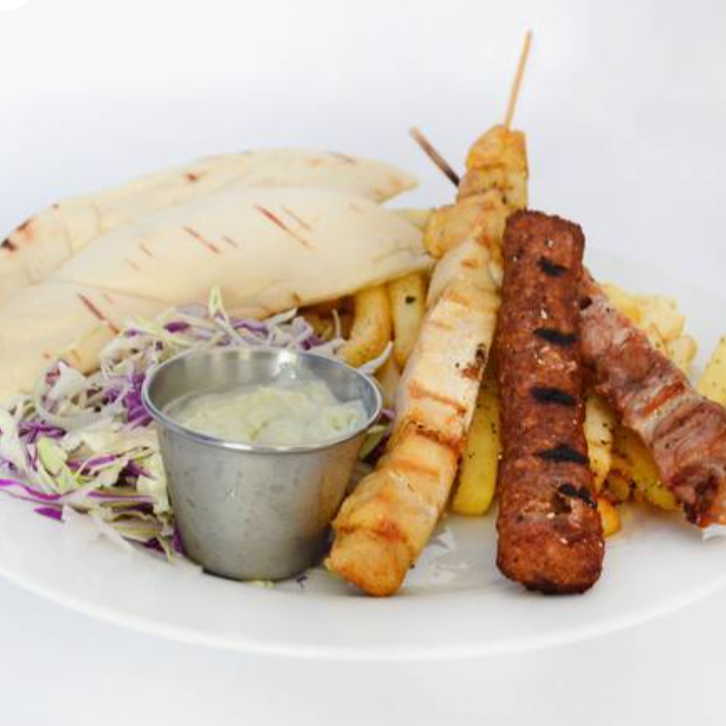 Brocheta de pollo, cerdo y 1 kebab (nueva receta), a la parrilla. Acompañado de papas fritas, pan pita, tzatziki y ensalada.