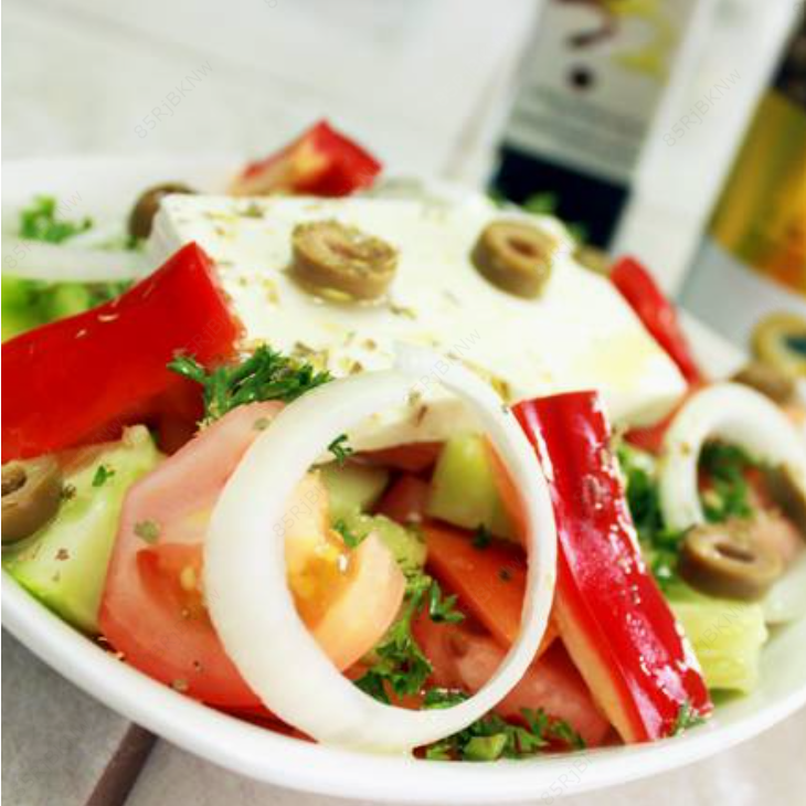 Tomate, pepino, cebolla, aceitunas, perejil, queso feta y aceite de oliva extra virgen.