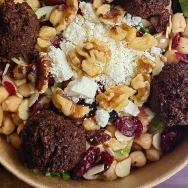 Base de ensalada verde, con 4 bolitas de felafel, garbanzos cocidos por nosotros, almendras, pasas, arándanos, nueces y queso feta. Con 2 opciones de aderezo a escoger.