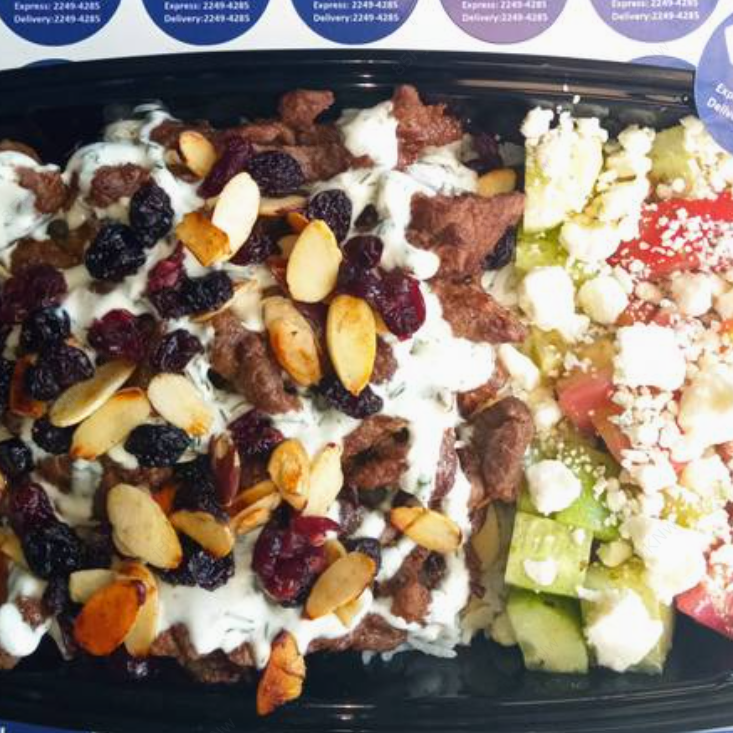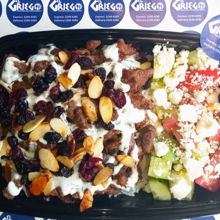 Bowl de res: Ensalada griega o hummus, arroz tipo basmati, gyro de res aderezado con salsa de yogur con hierbas frescas y aromáticas, almendras tostadas con arándanos y pasas.