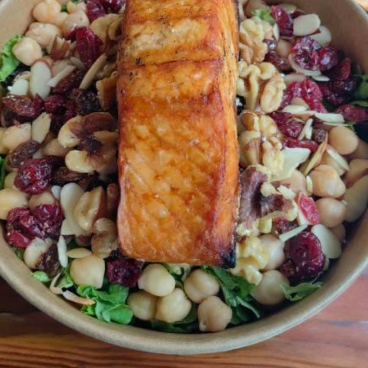 Base de ensalada verde, con porción de ensalada mediterránea con falafel, salmón a la parrilla (150 g), garbanzos cocidos por nosotros, almendras, pasas, arándanos, nueces. Con 2 opciones de aderezos a escoger.