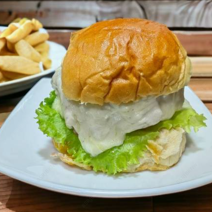 Torta artesanal de 180 g de carne black angus, asada a la parrilla, con lechuga, tomate,cebolla, pepinillos,tocineta, y queso derretido. Acompañado con papas fritas.