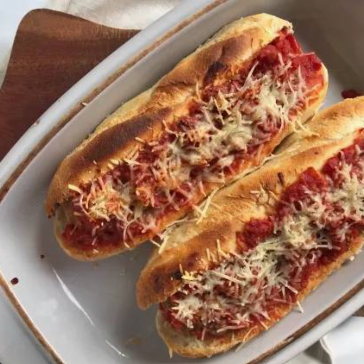 Pan grande 23 cm con orégano y parmesano hecho en casa, con jugosa carne de res, con una mezcla de quesos derretidos, mostaza dijon pepinillos mayo y cebolla. Acompañado de papas fritas.