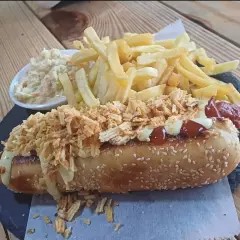 Pan artesanal suave de 25 cm, acompañado de una salchicha fritas de 20 cm cada una, bañados en nuestra deliciosa mayonesa artesanal, salsa de tomate con papas tostadas molidas, papas a la francesa, ensalada coleslaw.