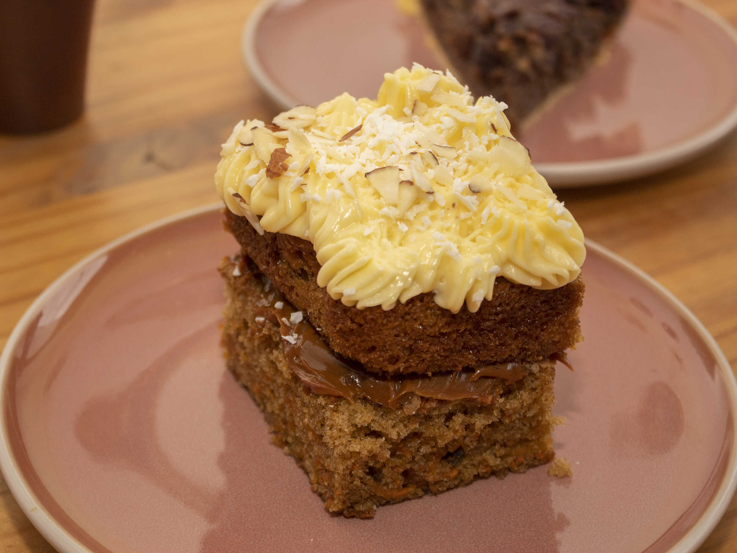 Esponjoso queque de zanahoria, relleno de dulce de leche y lustre.