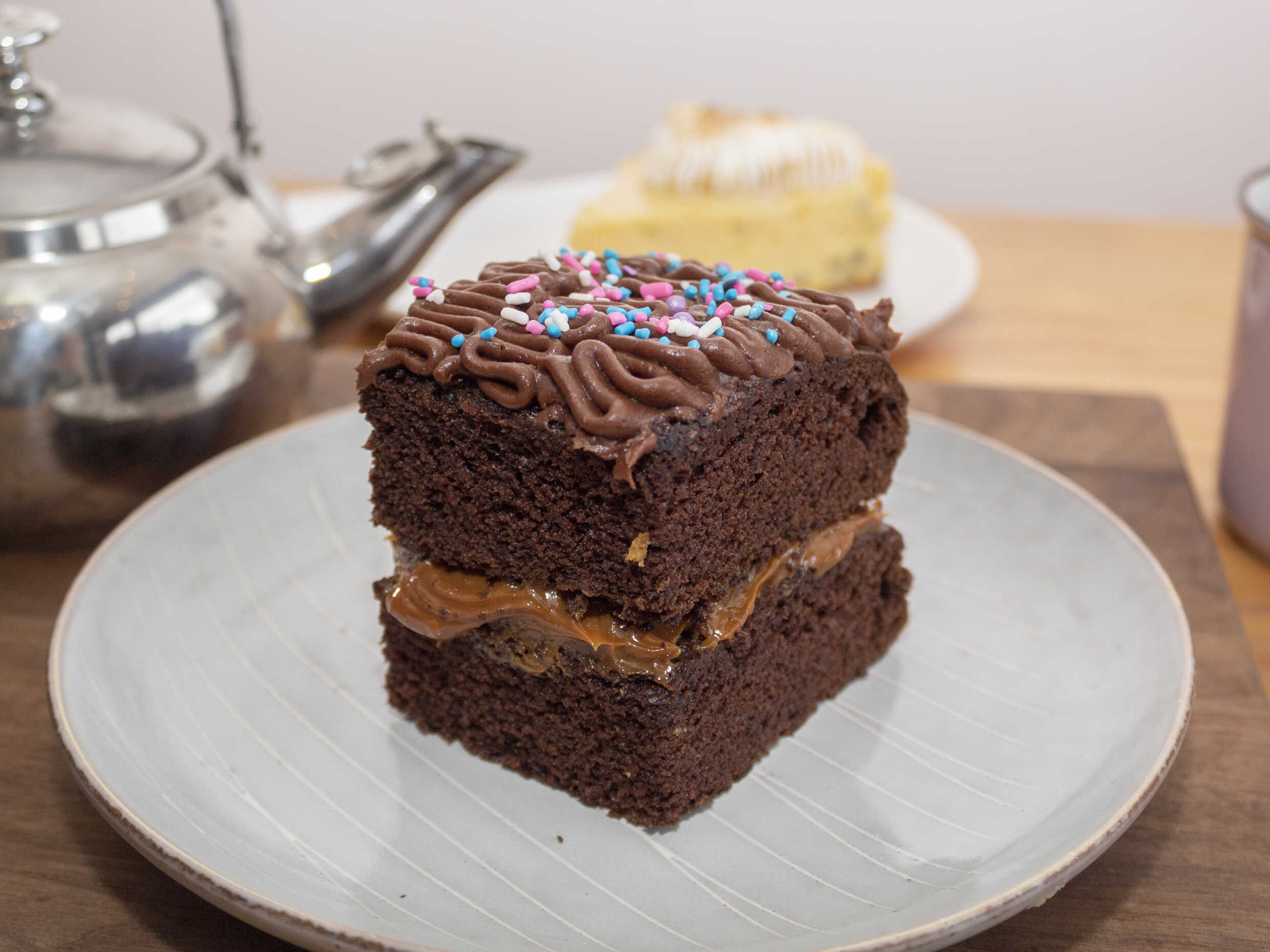Esponjoso queque de chocolate, relleno de dulce de leche y cubierto con buttercream de chocolate.