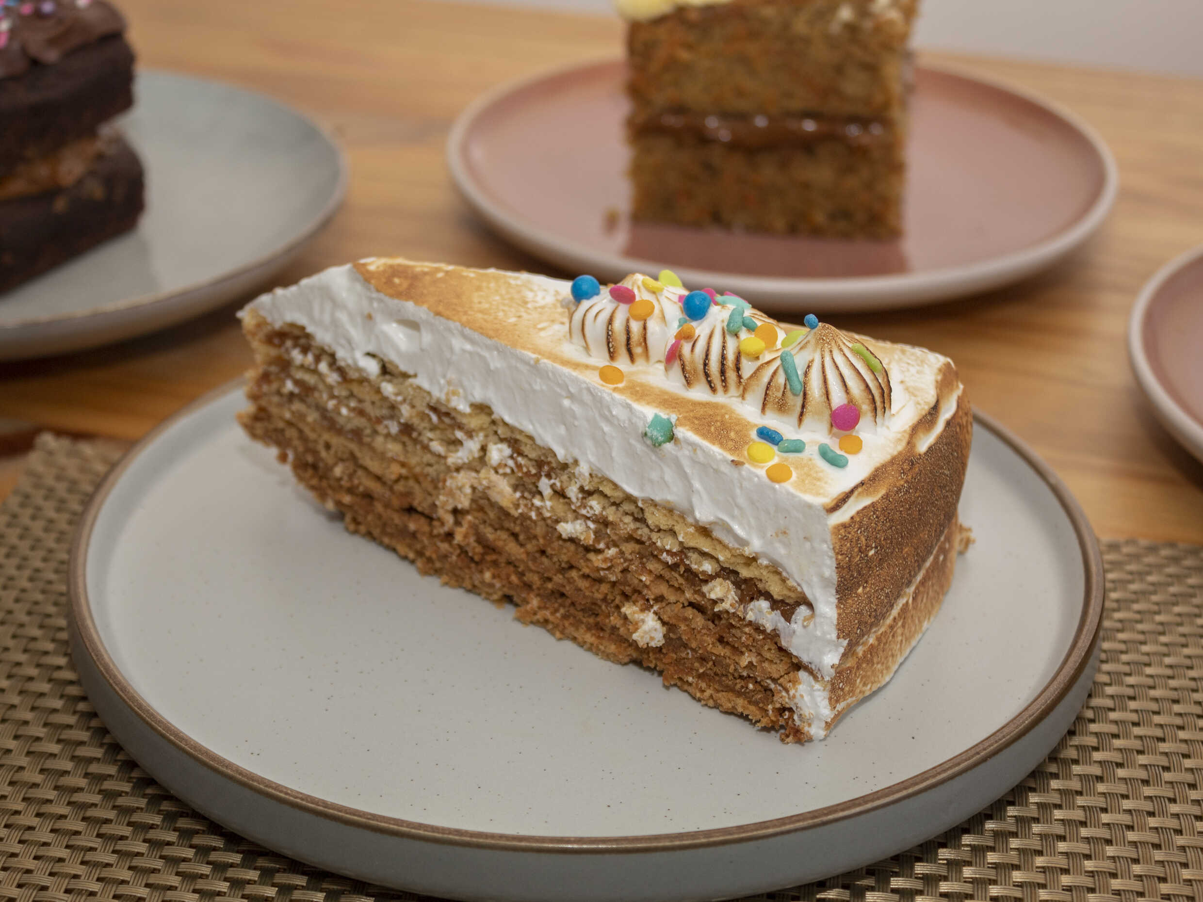 Deliciosas capas de galleta rellenas de dulce de leche, cubierta con merengue.