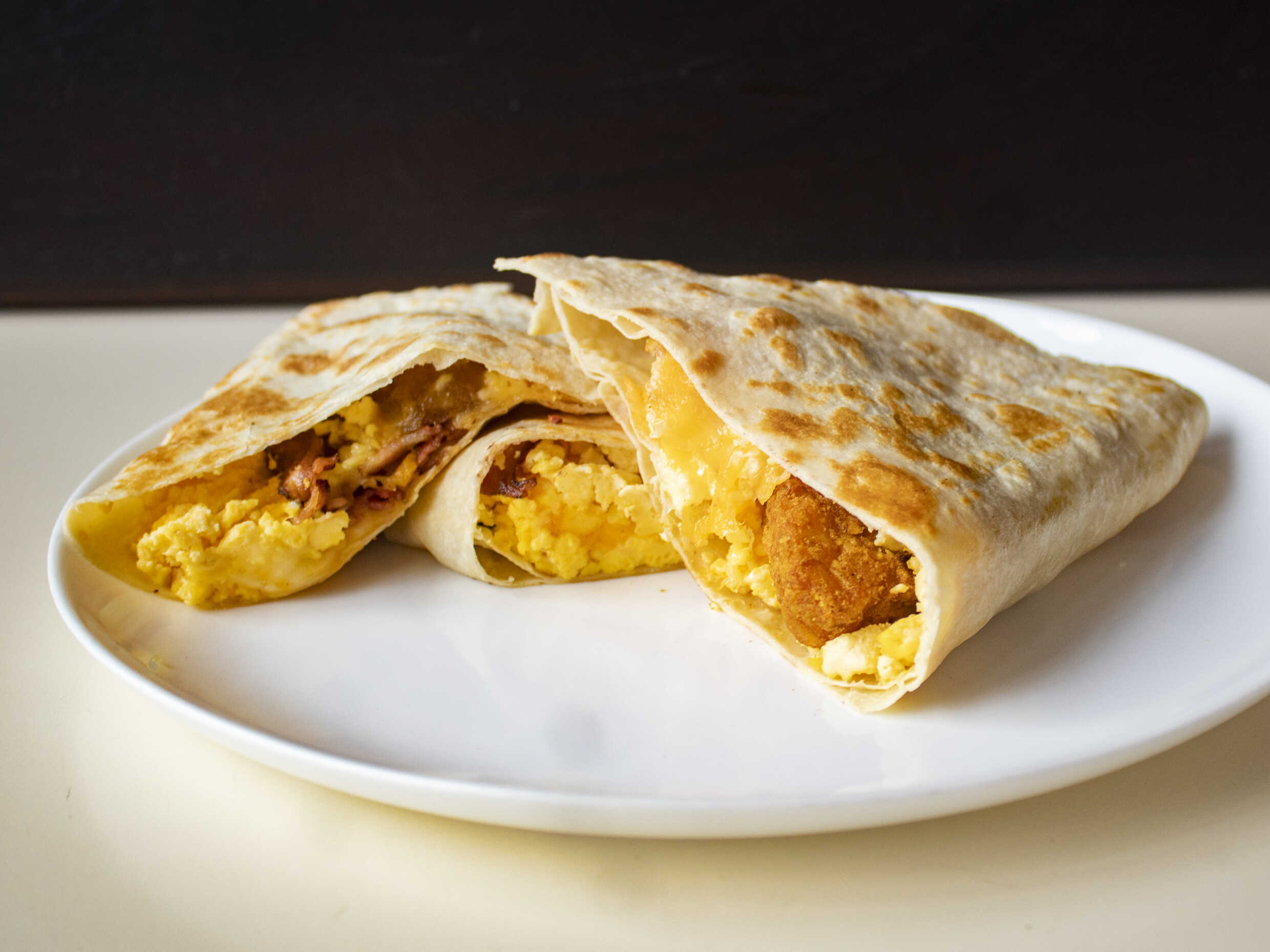 Tortilla de trigo rellena de huevo, queso mozzarella, queso cheddar, hash brown y tocineta