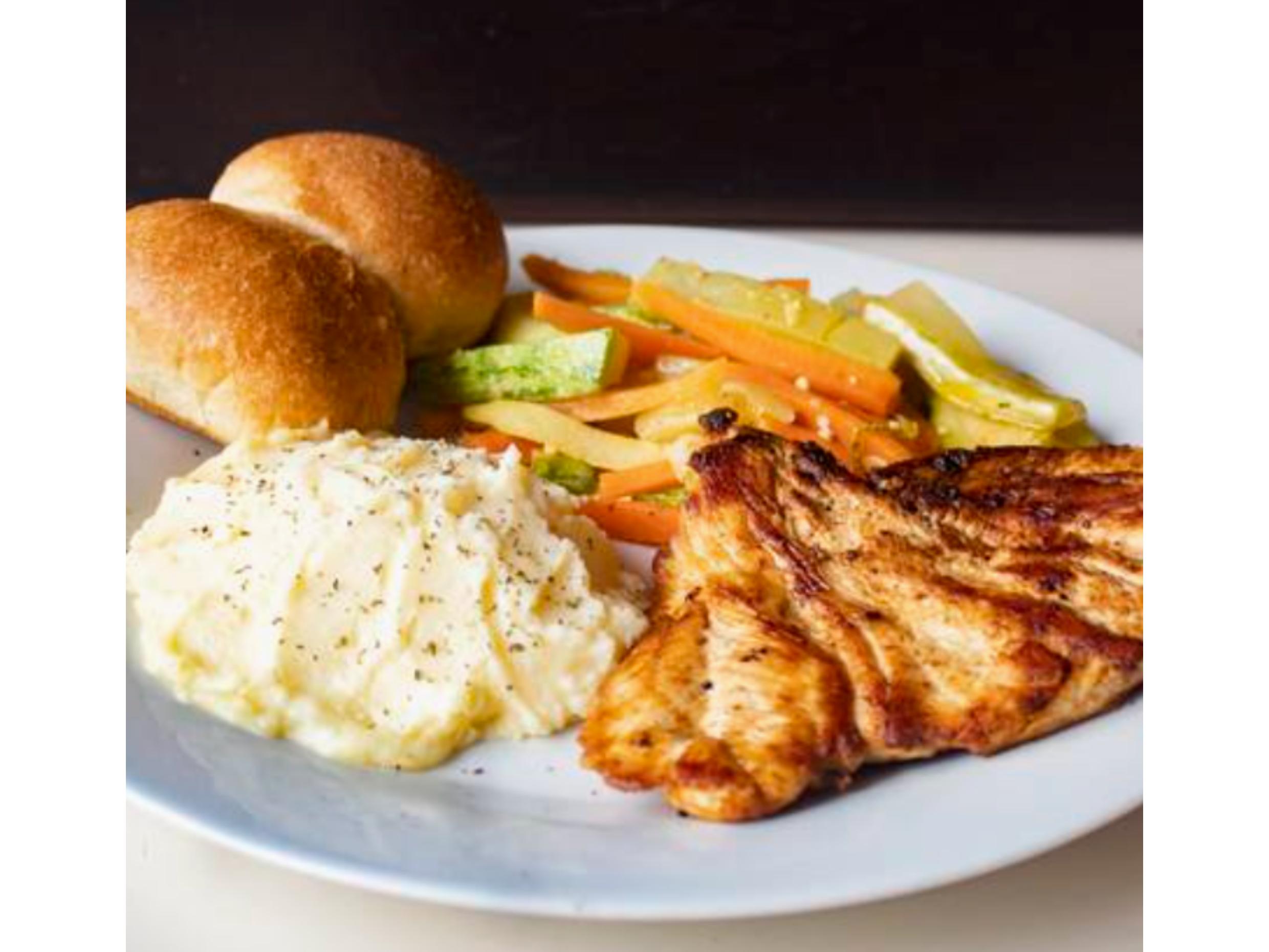 Puré de papa, vegetales salteados, pancitos de masa madre y proteína a elegir