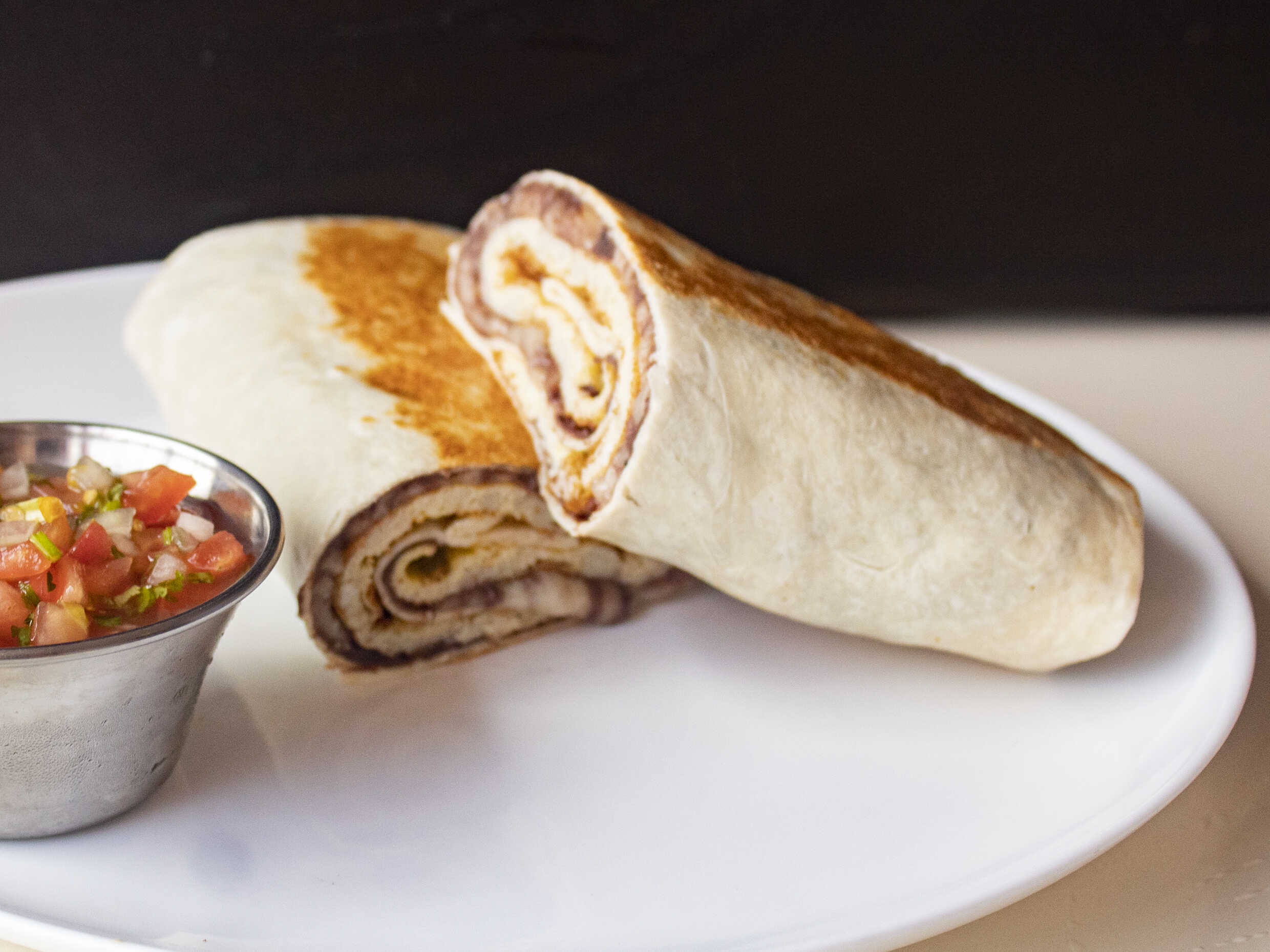 Tortilla de trigo en forma de burrito rellena con una capa de torta de huevo, frijoles molidos, pico de gallo y queso mozzarella