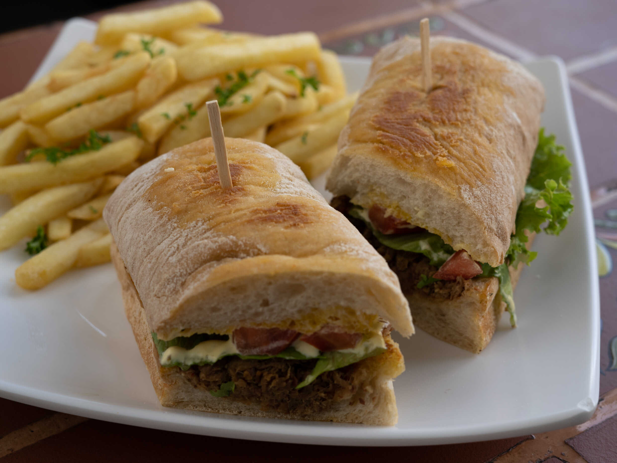 Elaborado con pan ciabatta, frijoles, lechuga, tomate, salsa de hierbas y carne mechada. Acompañado de papas fritas y gaseosa 355 ml.