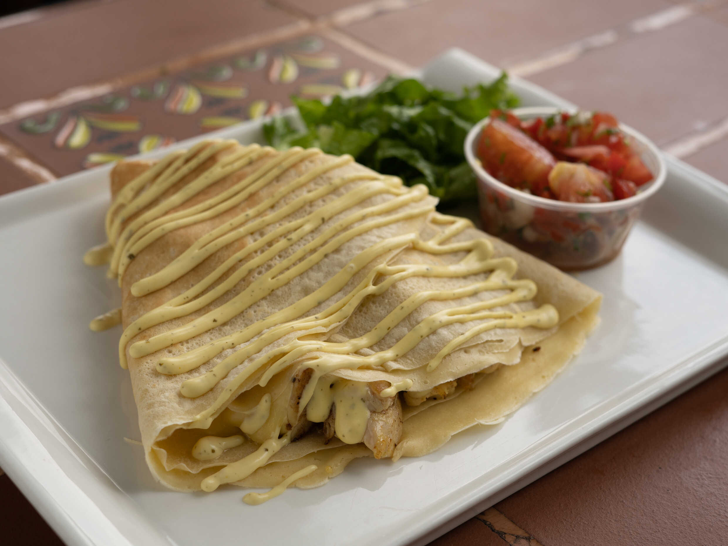 Deliciosa crepa de pollo en salsa de hierbas acompañada de ensalada de chimichurri.