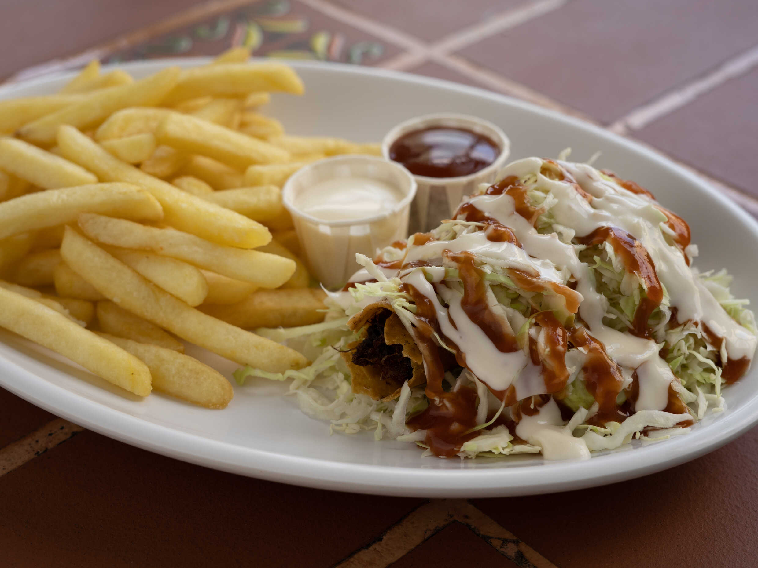 Papas fritas acompañadas de salsas aparte o bañadas.