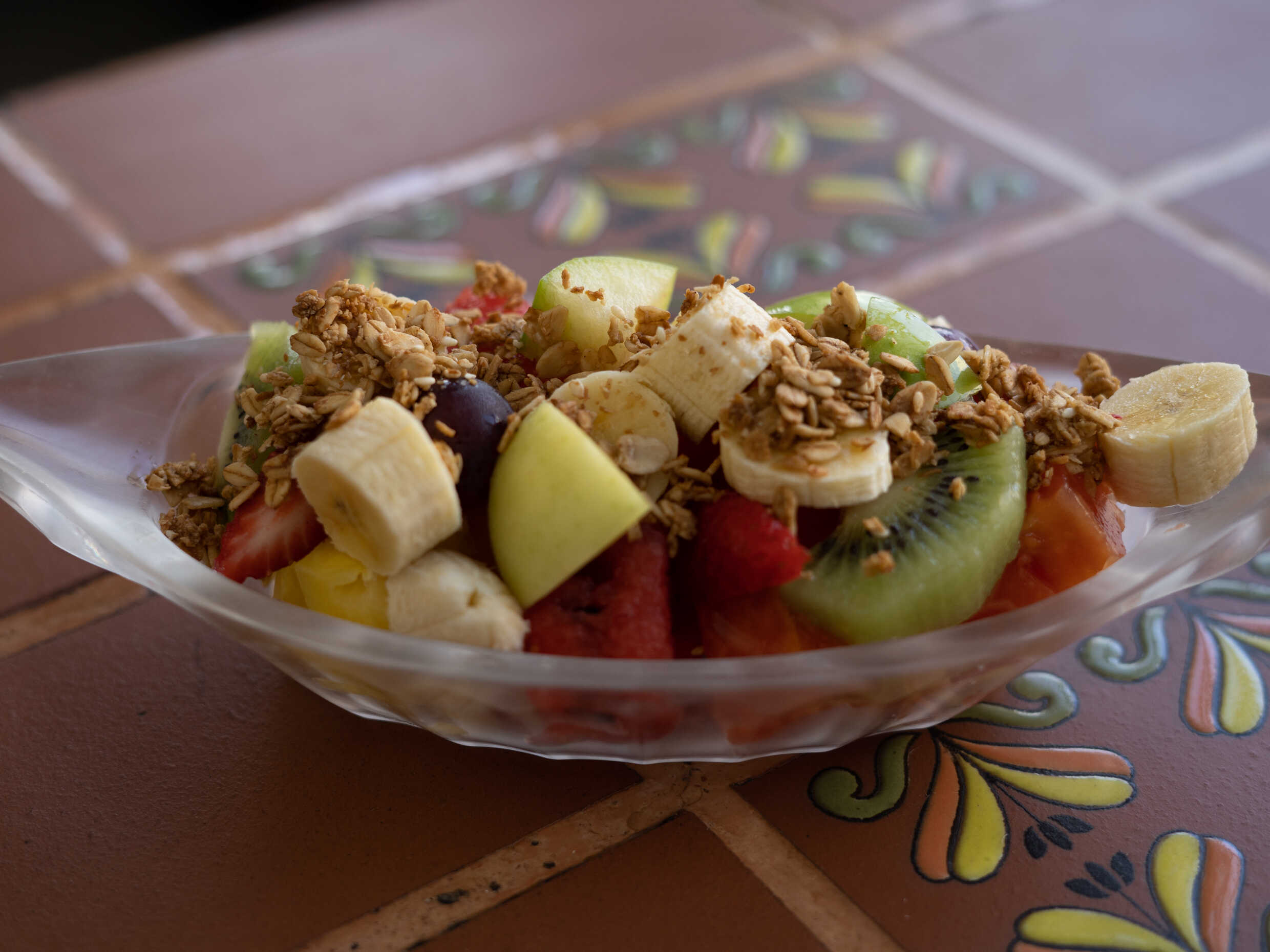 Ensalada de frutas frescas elaborada con piña, papaya, sandía, melón, banano, kiwi, fresa, uva y topping de granola.