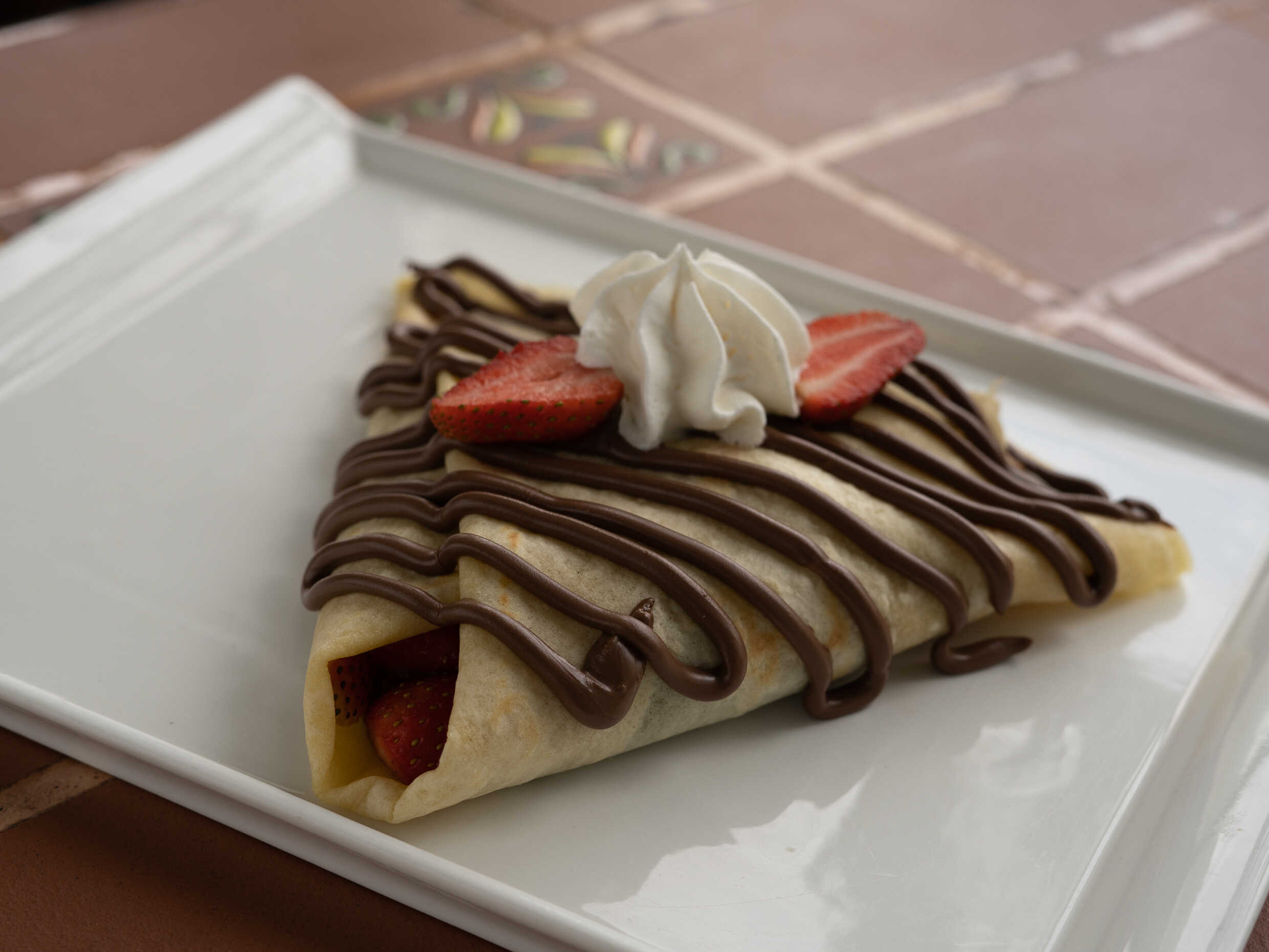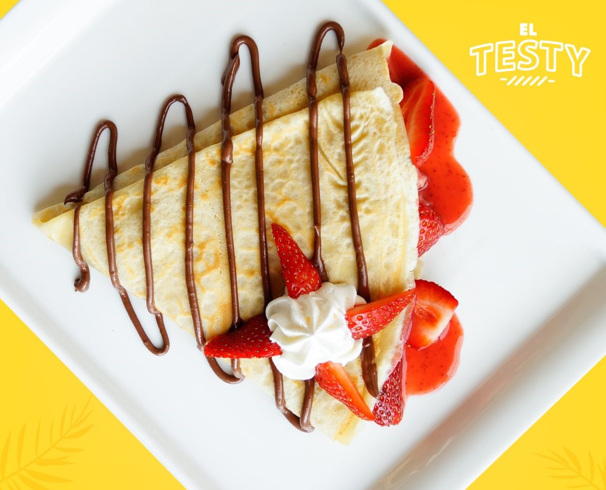 Deliciosa crepa elaborada con nutela, fresas naturales, salsa de fresa y crema chantilly