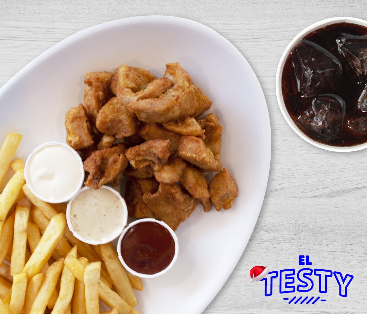 Deliciosos trocitos de filete de pollo frito acompañado de papas fritas y gaseosa 355 ml.