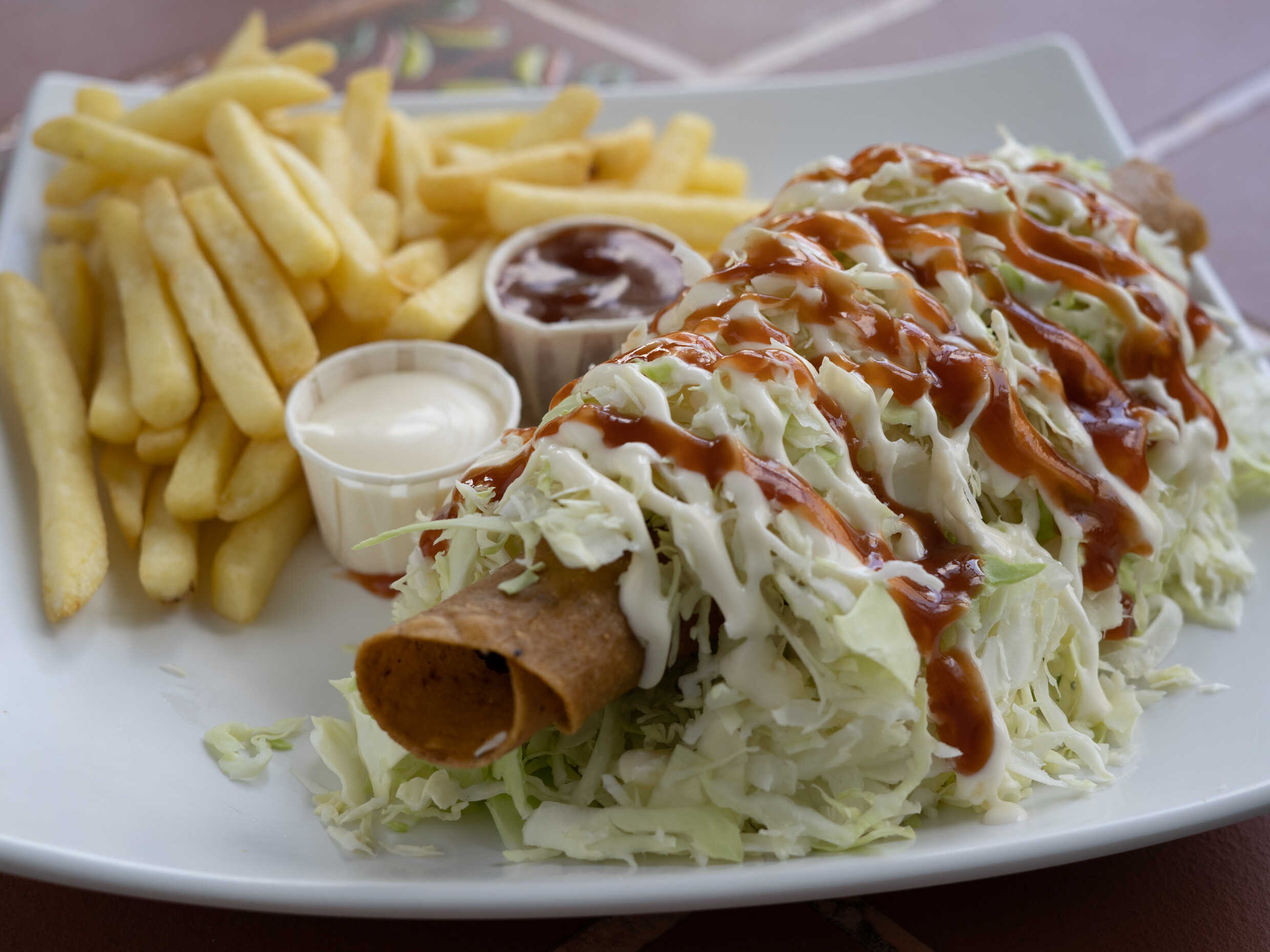 Orden de 4 tacos receta de la casa con repollo y salsa de tomate y mayonesa.
