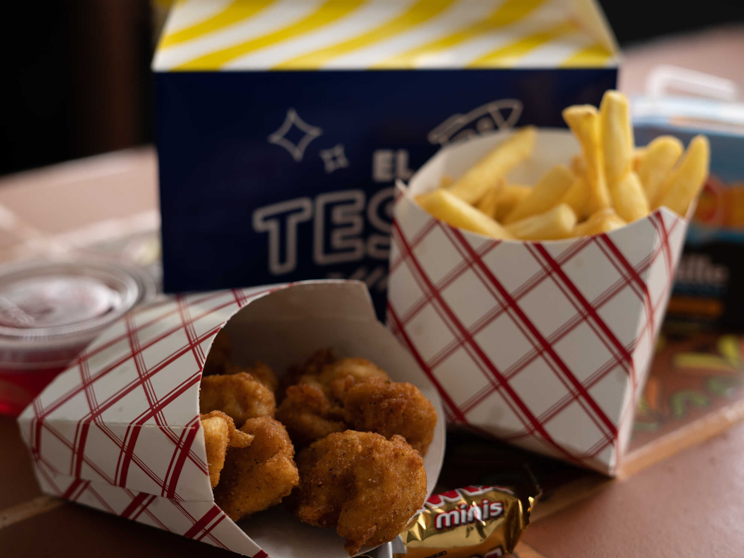 Deliciosos trocitos de filete de pollo frito acompañado de papas fritas pequeñas, con postre de chocolate de barra mini, gelatina y jugo 200 ml.