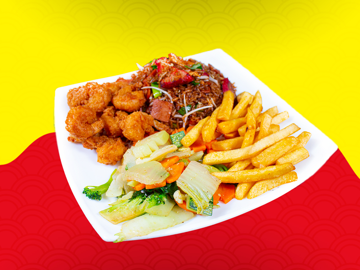 Incluye arroz, papas fritas y verduras (chayote, zanahoria, brócoli, coliflor).