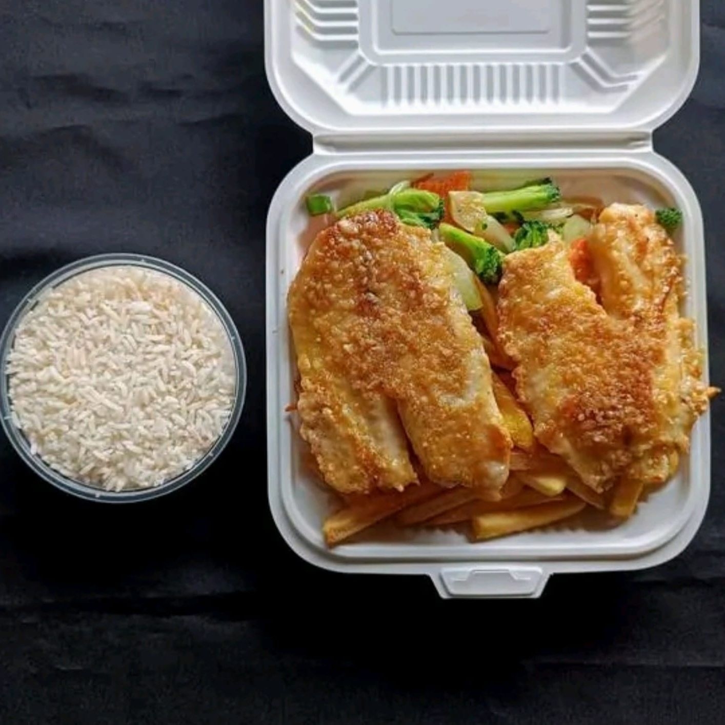 Arroz al estilo el wok con pescado empanizado. Cocinado en wok al instante.