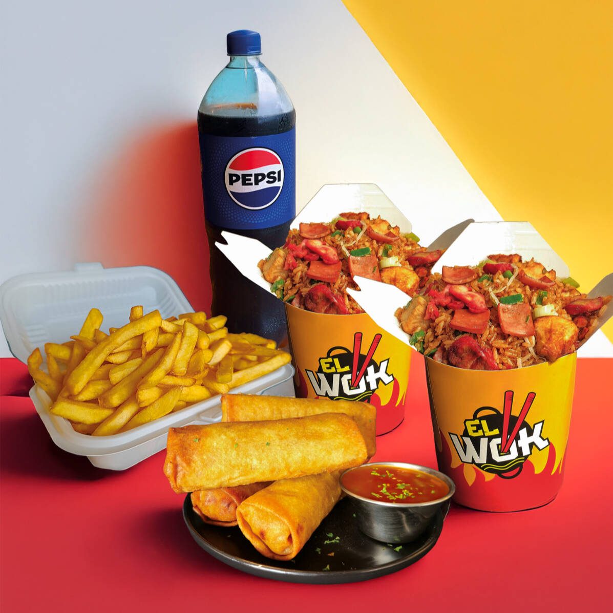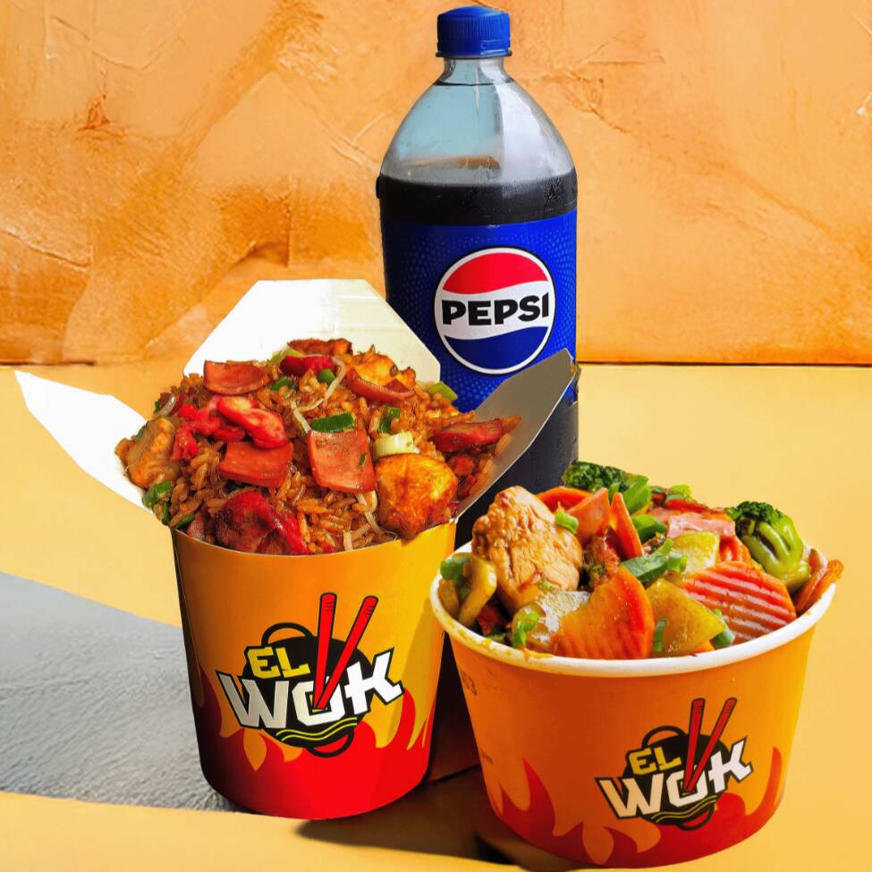 Un arroz cantones entero, un chop suey en salsa tradicional y una bebida pepsi 1.5L