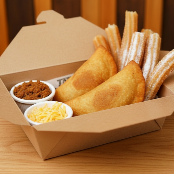 2 empanadas solteras a elegir acompañadas con una porción de churros y refresco natural a elegir