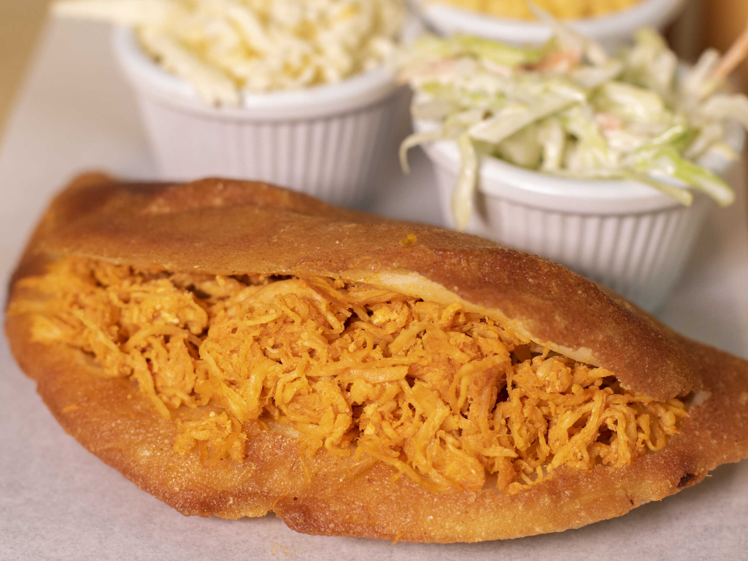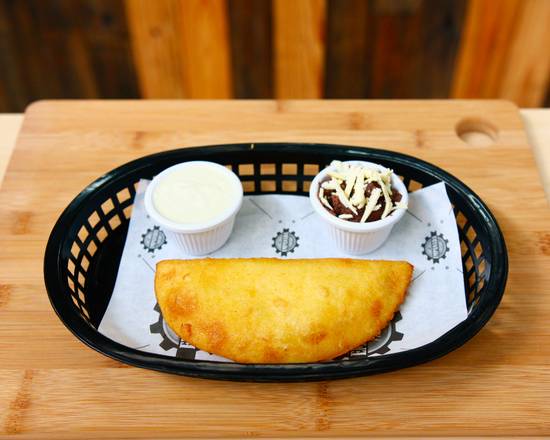Empanada rellena de carne mechada, frijol, queso y maduro.