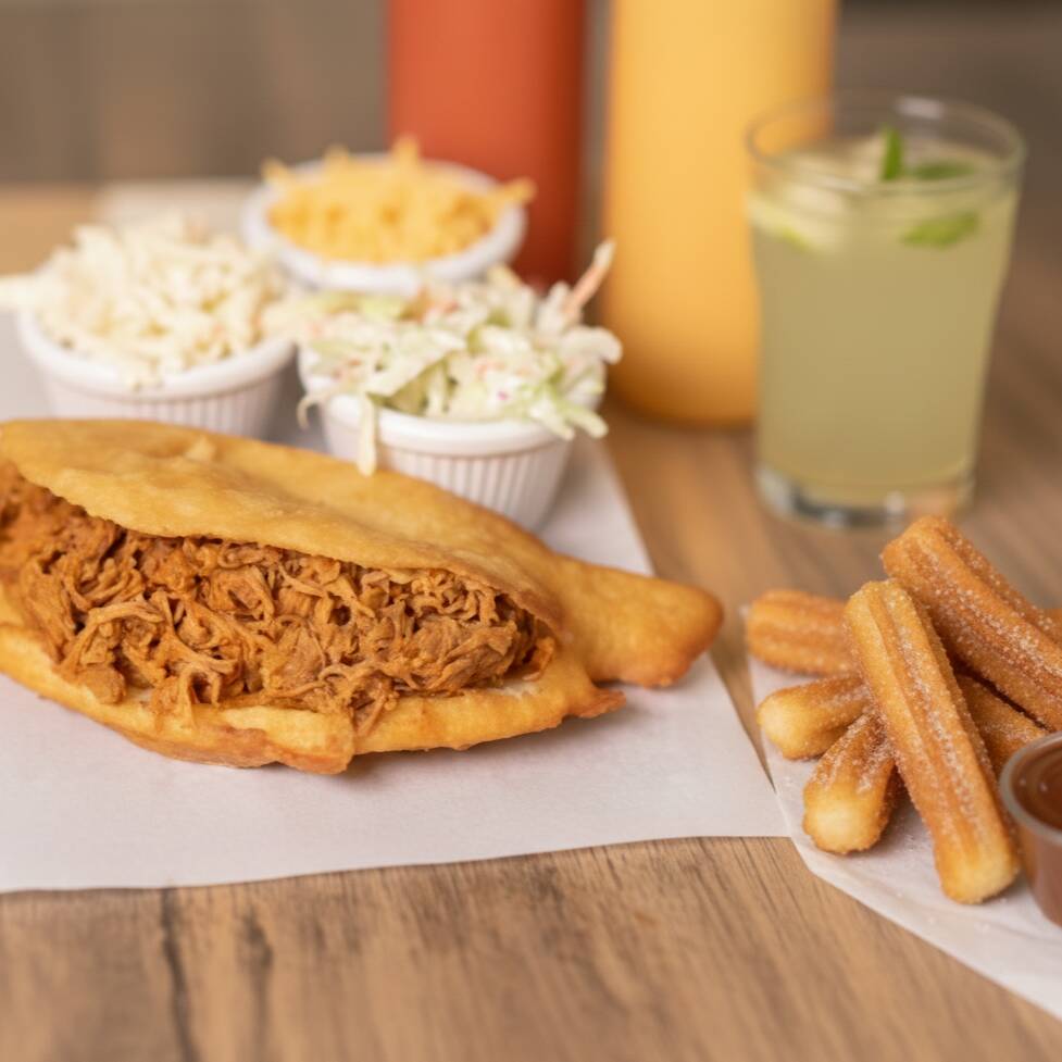 Empanada de Carne Mechada arreglada (con repollo y salsas) acompañado de fresco natural a elegir y porción de 4u de churros con su salsa a elegir