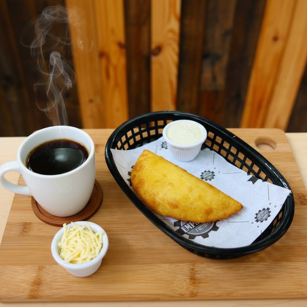 Empanada rellena con frijol y queso acompañada de un café chorreado