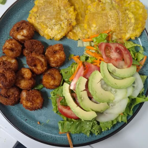 Camarones empanizados, ensalada verde (pepino con lechuga) con acompañamiento a elección. Incluye refresco natural.