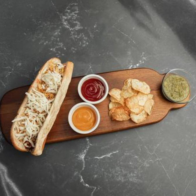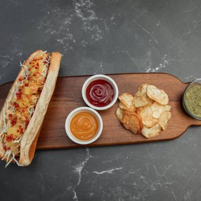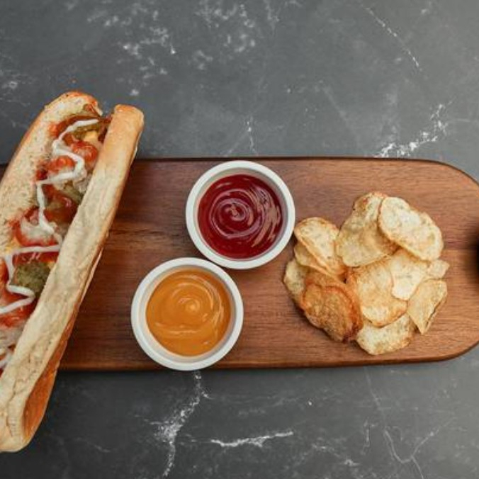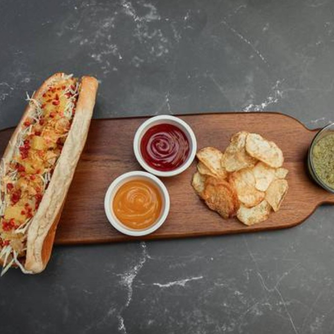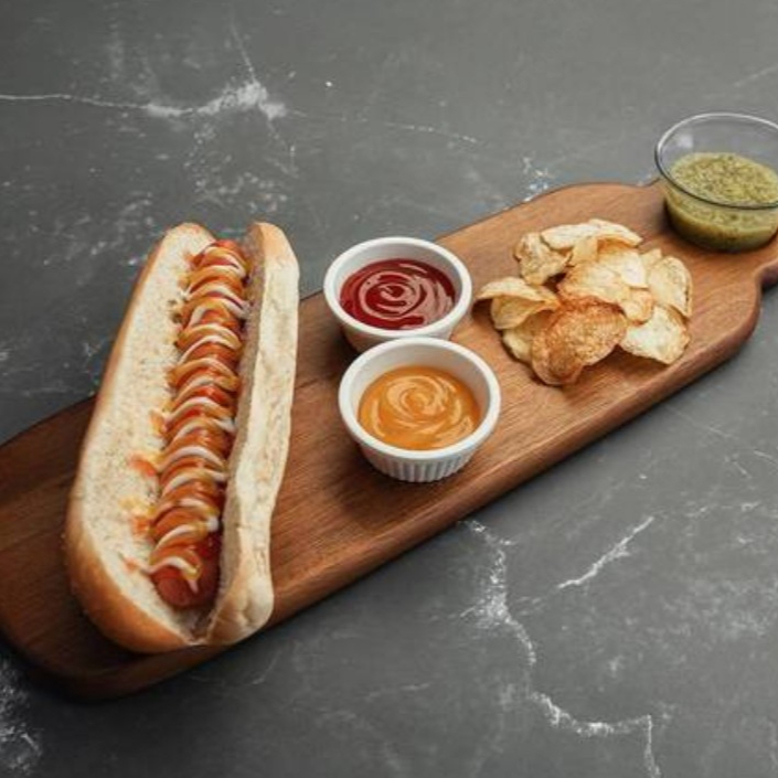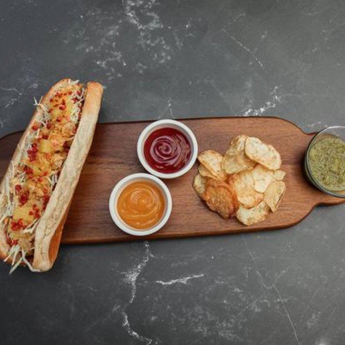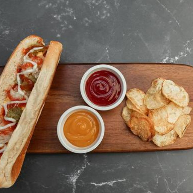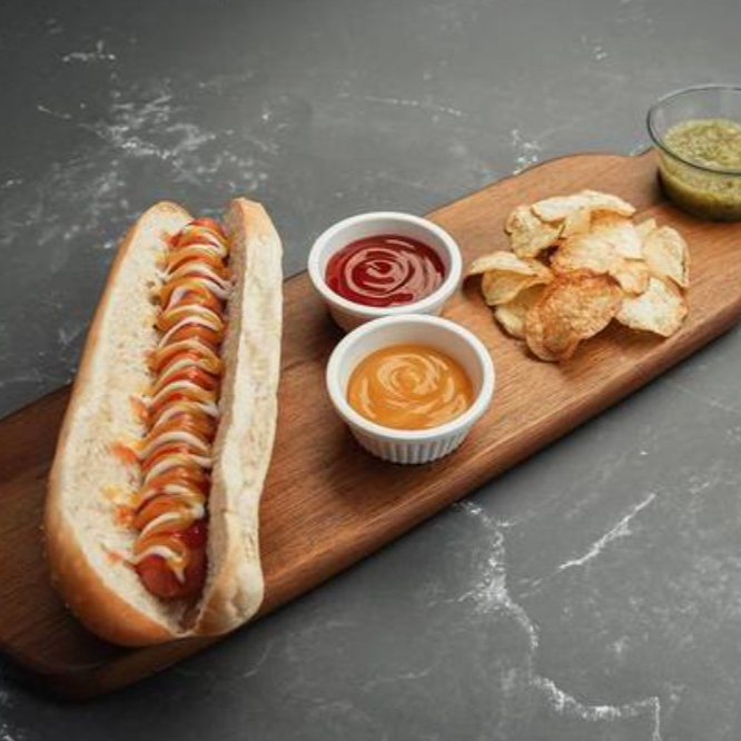 Pan, salchicha y 4 ingredientes a elegir, papas fritas yCoca Cola 355 ml