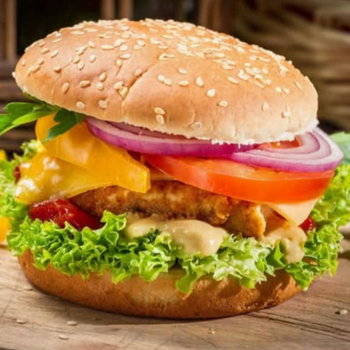 Pan brioche, pechuga de pollo empalizada, queso, cebollas, pepinillos, lechuga, tomate y aderezo